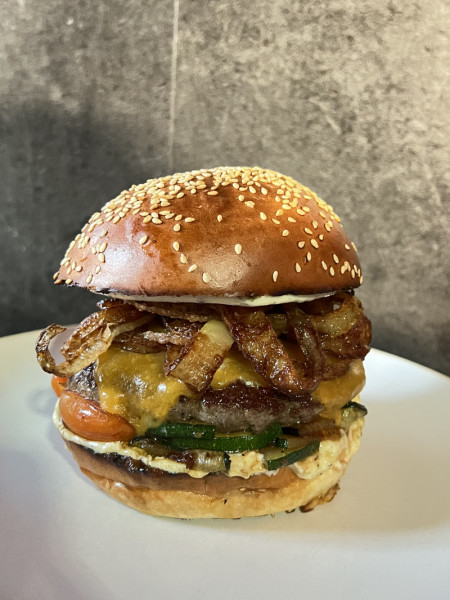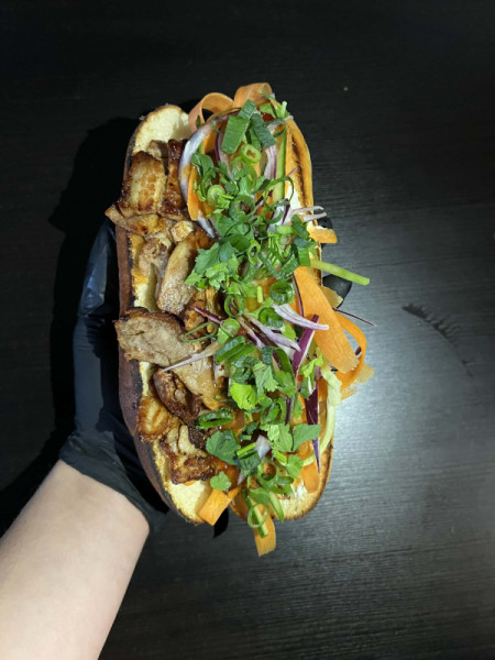 pečený bůček, mrkev, salátová okurka, jarní cibulka, koriandr, majonéza, sladkokyselá omáčka
